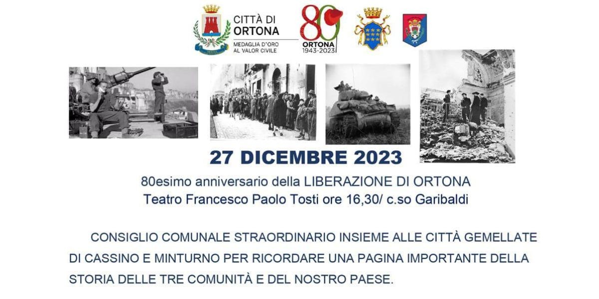 che vede la presenza dei rappresentati istituzionali delle tre città legate dalla storia e dai gemellaggi del 1991 e 2018 che in occasione della ricorrenza dell'80 della liberazione di Ortona e degli avvenimenti bellici che si svolsero sulla linea Gustav nell'inverno del'43 e primavera del'44, vogliono rafforzare questo legame istituzionale lanciando un messaggio di pace in un Natale che come 80 anni fa vede ancora molti fronti di guerra, nel cuore dell'Europa, in medioriente e in tutto il mondo. Per questo invito tutta la cittadinanza a condividere questo momento istituzionale dedicato alle tre comunità che dalla rofferenza e distruzione, con determinazione e forza di volontà , si sono risollevate ricostruendo il proprio futuro. In questo delicato momento internazionale che stiamo vivendo l'esercizio della memoria è ancora più essenziale per affrontare il futuro e per farci ricordare che non bisogna mai dare per scontata la libertà ».