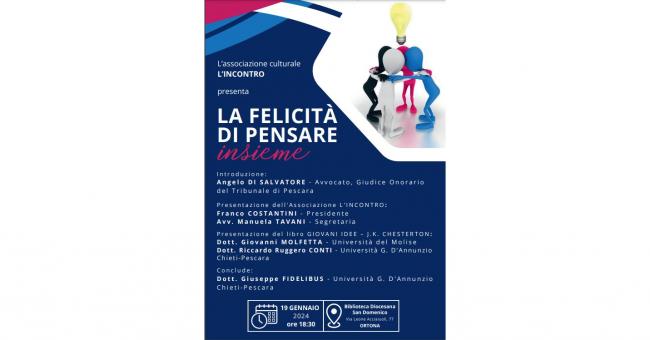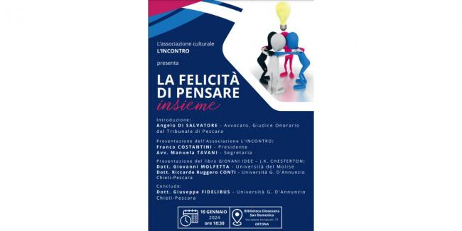 Evento culturale di sicuro interesse, quello di venerdì 19 gennaio presso la Biblioteca Diocesana San Domenico di Ortona – via Leone Acciaiuoli. Infatti alle ore 18,30 avrà inizio il convegno dal titolo La Felicità di Pensare Insieme, e vedrà la partecipazione di relatori provenienti da diverse università italiane; tutti invitati per la presentazione del libro dal titolo Giovani Idee di J. K. Chesterton.