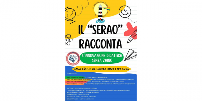 L’evento “Il Serao Racconta – L’innovazione didattica Senza Zaino " ha il fine di divulgare i princìpi pedagogici e la struttura organizzativa e didattica del modello innovativo della scuola senza zaino, nella comunità e ai partecipanti.