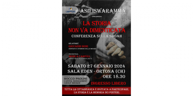 L' ASD Isharamma di Luigi Nervegna organizza una Conferenza sulla Shoah dal titolo “La storia non va dimenticata” per sabato 27 Gennaio alle ore 18.30 in Sala Eden.