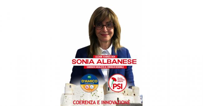 I socialisti di Ortona comunicano l'accettazione della candidatura per il Partito Socialista Italiano alle prossime elezioni regionali, nella lista "Riformisti e Civici", della dott.ssa SONIA ALBANESE cardiochirurga pediatrica presso l'Ospedale Pediatrico Bambino Gesù di Roma ed attiva nel sociale e nell'ambito delle pari opportunità, a sostegno del candidato Presidente della Regione Abruzzo Luciano D'Amico.