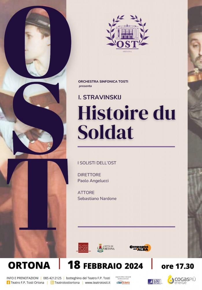 In scena i solisti dell’Orchestra Sinfonica Tosti, per la direzione del Maestro Paolo Angelucci. L’opera racconta la storia di un seducente accordo tra un soldato e il diavolo, in cui un violino viene barattato in cambio di ricchezza, unendo musica e narrazione in un esperimento unico e avvincente. La serata vedrà la speciale partecipazione dell'attore Sebastiano Nardone, che guiderà il pubblico in un viaggio tra rimpianto e rivelazione, attraverso una delle narrazioni più affascinanti del repertorio classico. Questi i solisti dell’OST che si esibiranno: violino Erika Vagnoni, contrabbasso Guerino Taresco clarinetto David Perpetuini, tromba Davide Paludi , fagotto Gabriele Pingue, trombone Andrea Morone,percussioni Marco Ricordi.