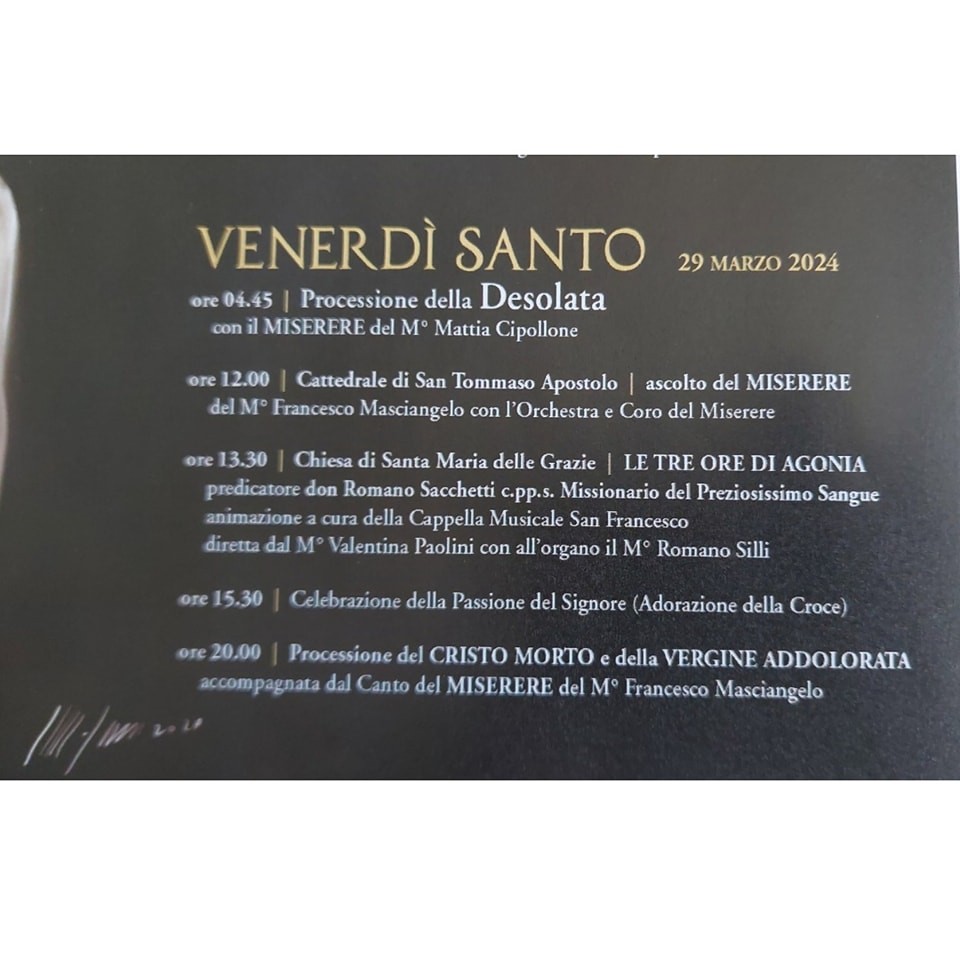 Al presidente Scoccimarra il compito di illustrare le novità dell'edizione 2024: "Prima novità la processione del mattino della Beata Vergine Maria Desolata farà una sosta al cimitero capoluogo per un momento di riflessione dedicato ai defunti. La sera, poi, la processione sarà un po' più breve perché dopo la partenza da piazza san Francesco si sfilerà in via Cavour per arrivare in piazza della Repubblica e riprendere da qui il consueto itinerario. Difficile coordinare una macchina composta da 350 persone, c'è bisogno dell'aiuto di tutti i cittadini. Non è obbligatorio associarsi chi vuole può farlo oppure può scegliere, semplicemente, di prendere parte alla processione".