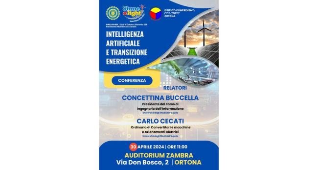 “ Intelligenza artificiale e transizione energetica “ questo il tema della conferenza organizzata per alle 11:00 di martedì 30 Aprile nell’auditorium Zambta in Via Don Bosco 2 a Ortona.