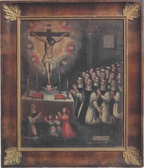 Il miracolo è legato all'assalto dei Turchi del 1566, quando gran parte dei luoghi di culto abruzzesi furono incendiati e depredati. Il piccolo oratorio e il suo convento fu risparmiato dalla orda saracena grazie ad un avvenimento prodigioso, che coinvolse l'affresco di Gesù Crocifisso, presente nell'oratorio. Mentre le suore erano in preghiera il 13 giugno 1566 dal costato di Gesù sgorgò del sangue, che fu raccolto in due ampolle. Queste vennero trafugate da un padre confessore che le portò a Venezia.