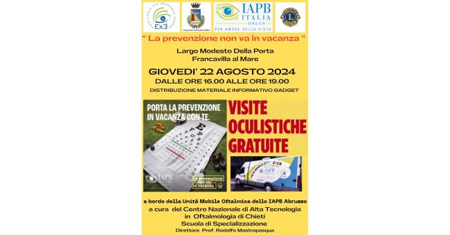 L'ultimo appuntamento, dei cinque previsti lungo la costa teatina è per giovedì 22 agosto dalle ore 16 alle 19, a Francavilla al mare, presso largo Modesto Della Porta. La campagna di controlli e sensibilizzazione è finanziata e organizzata dal comitato regionale abruzzese dell'Agenzia Internazionale per la Prevenzione della Cecità I A.P. B. In collaborazione con la ASL di Chieti, l'Università "G. d'Annunzio",con la Scuola di Specializzazione in Oftalmologia del Centro Nazionale di Alta Tecnologia, diretta dal professor Rodolfo Mastropasqua, il Comitato Vista Lions e il club Lions.