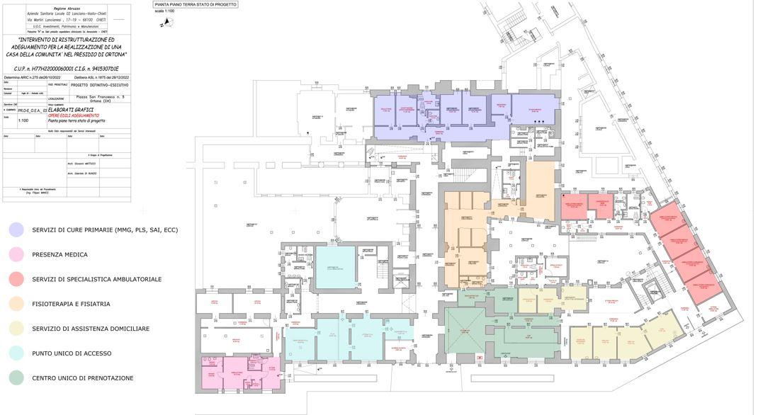 La Casa di Comunità a Ortona sorge all'interno del Distretto sanitario di piazza San Francesco, con i lavori di riqualificazione che andranno avanti per fasi, visto che si rende necessario coniugare le attività del cantiere con la continuità dei servizi per la salute.