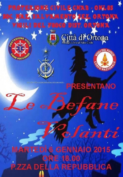 “La tradizionale Befana volante”, spiega l'organizzatore dell'evento Francesco Di Tullio, “è una manifestazione suggestiva e coinvolgente che riscuote sempre un grande successo di pubblico di giovanissimi e non solo. Colgo l'occasione per ringraziare il Corpo nazionale dei Vigili del Fuoco, in particolare il Comandante della Provincia di Chieti, l'ing. Antonio Albanese, il coordinatore provinciale del Saf, Michele Sulpizio che curerà anche l’edizione di quest’anno e il comandante del distaccamento di Ortona, Antonio Flacco, che metterà a disposizione mezzi e personale”.