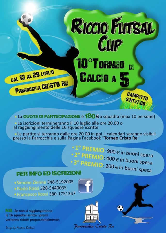 Tutto pronto per il "Riccio futsal cup", 10° torneo di calcio A5 che si disputerà dal 13 al 29 luglio presso la Parrocchia Cristo Re, dalle ore 20,00 in poi.