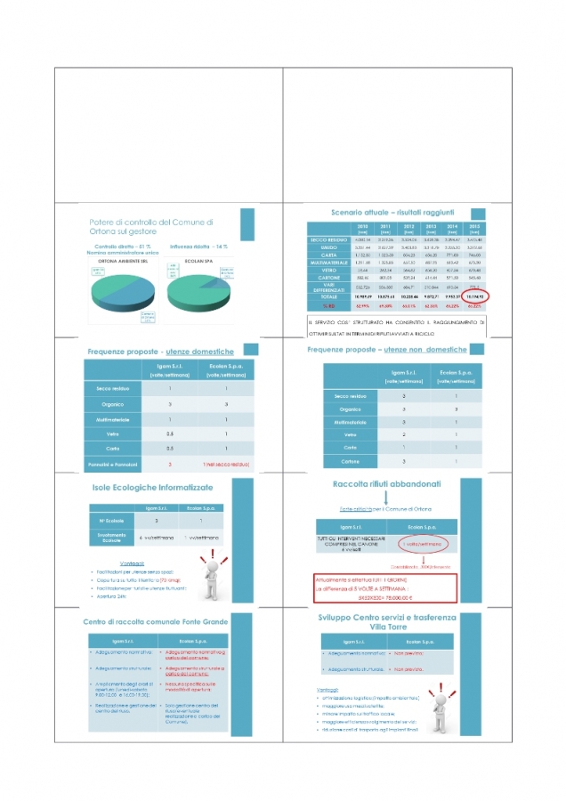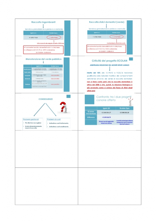 d)la Igam prevede la raccolta dei rifiuti abbandonati sei volte a settimana, la raccolta degli ingombranti e degli sfalci domestici quattro volte al mese mentre la Ecolan ne prevede solo uno a settimana per le discariche abusive e uno al mese per gli altri, chiedendo un compenso aggiuntivo di € 300,00 per ogni raccolta eccedente quella prevista;