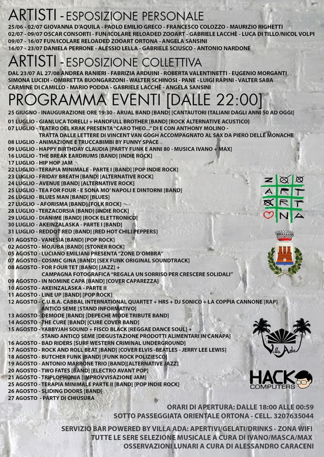 Il programma prevede esposizioni personali dal 25 Giugno al 23 Luglio e collettive di artisti dal 23 Luglio dal 27 Agosto mentre durante tutto il periodo ( 25 Giugno-27 Agosto ) ci saranno intrattenimenti musicali, spettacoli teatrali, attività per bambini.