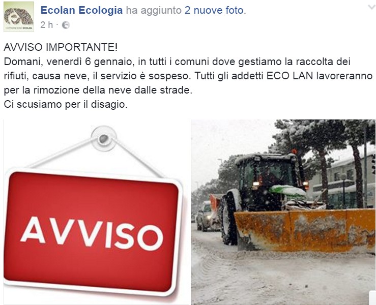 la Ecolan ha annunciato che sarà sospeso il servizio di raccolta dei rifiuti, al momendo solo per domani,