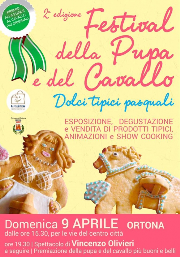 Un'iniziativa diversa e divertente che, alla sua conclusione, vedrà premiati la pupa ed il cavallo più originali nella forma e nel sapore. La giuria sarà composta da esponenti dell'associazione dei commercianti ortonesi che assaggeranno e osserveranno le forme, i colori, le trovate di ogni creazione. Le vincitrici o vincitori avranno come premio dei buoni acquisto presso i negozi aderenti all'associazione, In sostanza una giornata di SHOPPING. La quadriglia, il laccio d'amore, le musiche della tradizione, i Colori del territorio e Maccabarri e Il gruppo di danze etniche della maestra Anna Anconitano completeranno il programma di questo festival che, i commercianti si augurano, continui anche negli anni futuri.