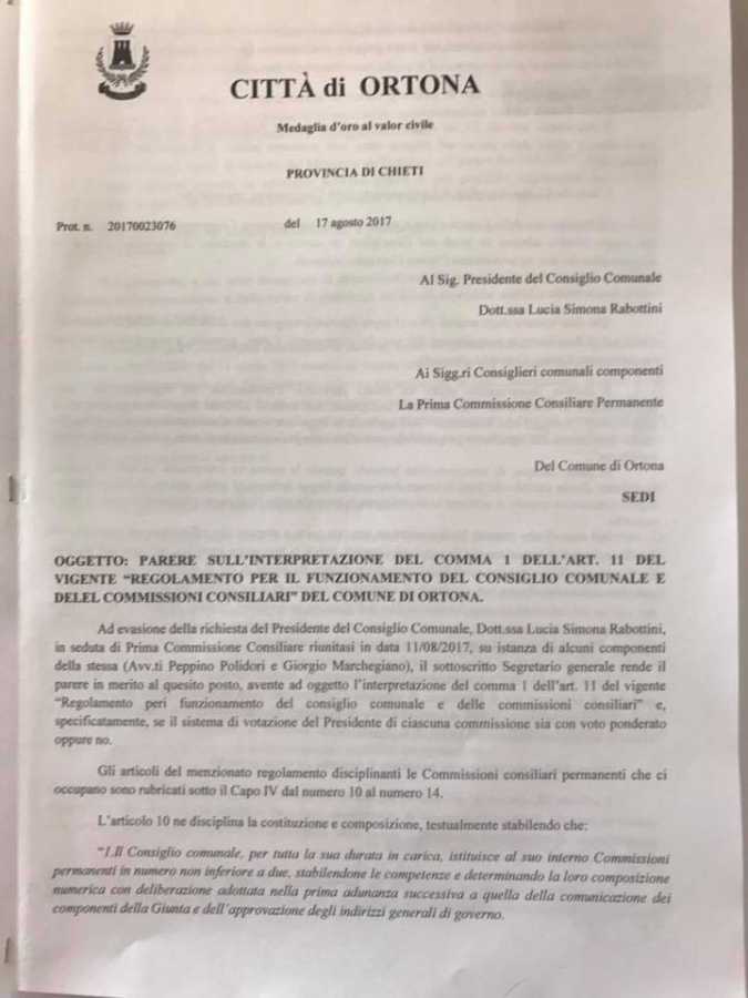 Per ora buon lavoro a quei cittadini che hanno a cuore Ortona nella legalità e trasparenza ".