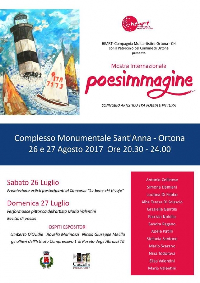 La premiazione dei poeti, man mano succedutisi nel corso della serata, ha visto anche il conferimento del Premio “Poesimmagine Ortona-Donna” alle artiste pittrici che partecipano alla Mostra Internazionale itinerante di “Poesimmagine”, allestita per l’occasione nel chiostro Sant’Anna, attualmente in giro in diverse località d’Abruzzo, che sono: Alba Teresa Di Sciascio, Adele Patilli, Sandra Pagano, Simona Damiani, Stefania Santone, Luciana Di Febbo, Nina Todorova, Maria Valentini, Patrizia Nobilio; la Mostra è già stata presentata a Notaresco, San Valentino in Abruzzo Citeriore, ora a Ortona, sarà inoltre presente a giorni nelle belle località di San Demetrio ne’ Vestini (AQ), di Filetto, di Guardiagrele e di Cologna spiaggia.