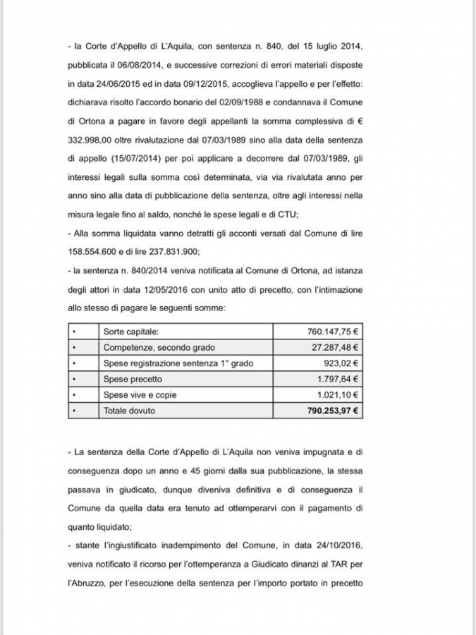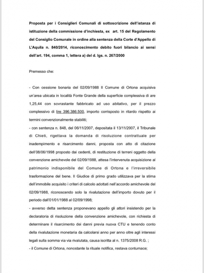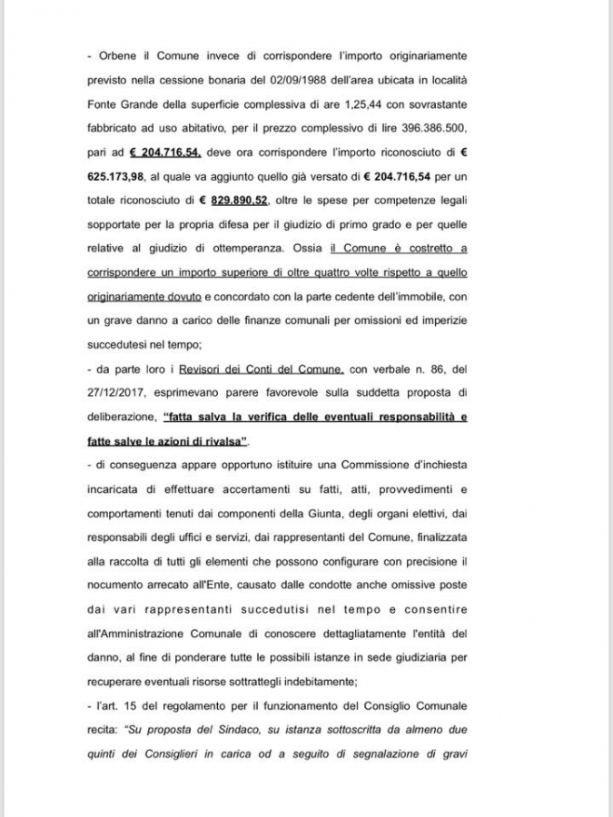 E’ bene che si faccia luce anche su quelle vicende, delicate e controverse, come nel caso dell’esproprio milionario, dove una cifra di partenza già pagata si è poi quadruplicata, vicenda che metterà in difficili condizioni le casse Comunali. Ho ricostruito tutti passaggi e- chi mi segue potrà leggere tutto per bene -, nella istanza che allego. Nel presentare la richiesta di Commissione d’inchiesta e nel formalizzarla ho sollecitato il sostegno degli altri consiglieri, per ora hanno firmato tutti i colleghi della minoranza. Mi auguro che dando, per così dire il buon esempio, firmino anche il sindaco Castiglione e i consiglieri di maggioranza. Infatti ci sono temi che richiedono la massima collaborazione tra partiti e consiglieri nell’interesse di tutti i cittadini.