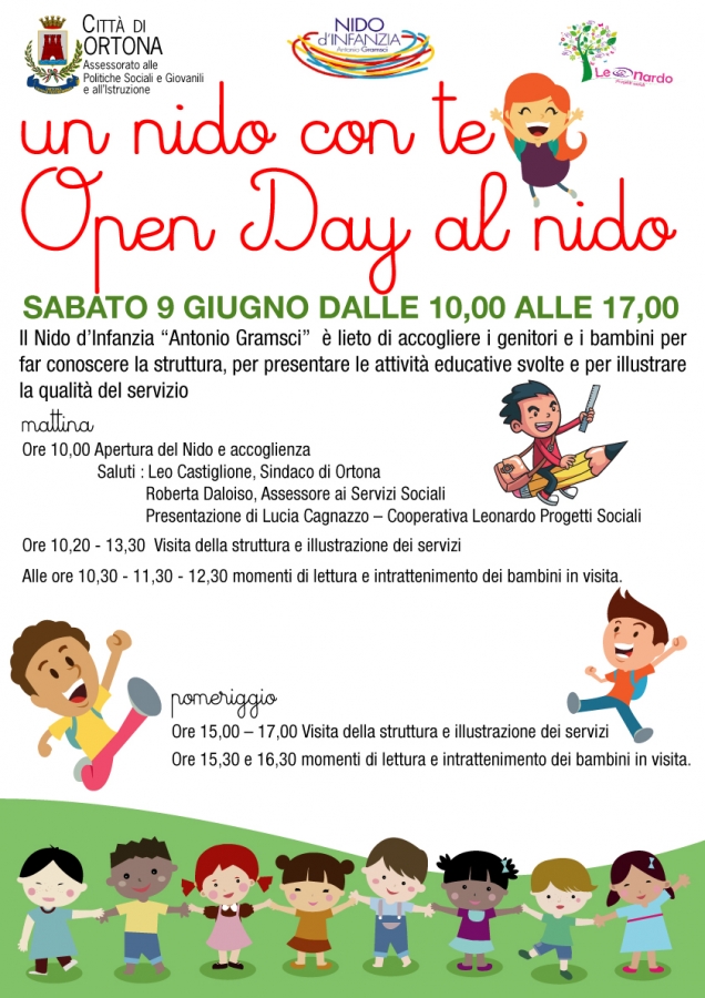 Il Nido d'Infanzia comunale "Antonio Gramsci" sabato 9 giugno resterà aperto per l'intera giornata, dalle ore 10 alle 17, per accogliere le famiglie e presentare i servizi e la struttura, le modalità e i programmi educativi. I genitori e i bambini potranno recarsi presso il Nido per conoscerlo meglio, informarsi degli aspetti organizzativi e logistici, conoscere il personale che da settembre prossimo accompagnerà i bambini nei percorsi di apprendimento e nelle numerose iniziative a loro destinate. «Il Nido di Ortona – dichiara l'Assessore Roberta Daloiso – ha caratteri elevati di qualità sia per la cura dei bambini che per la loro educazione, e costituisce un patrimonio importante per l'intera città da salvaguardare e sviluppare ulteriormente».