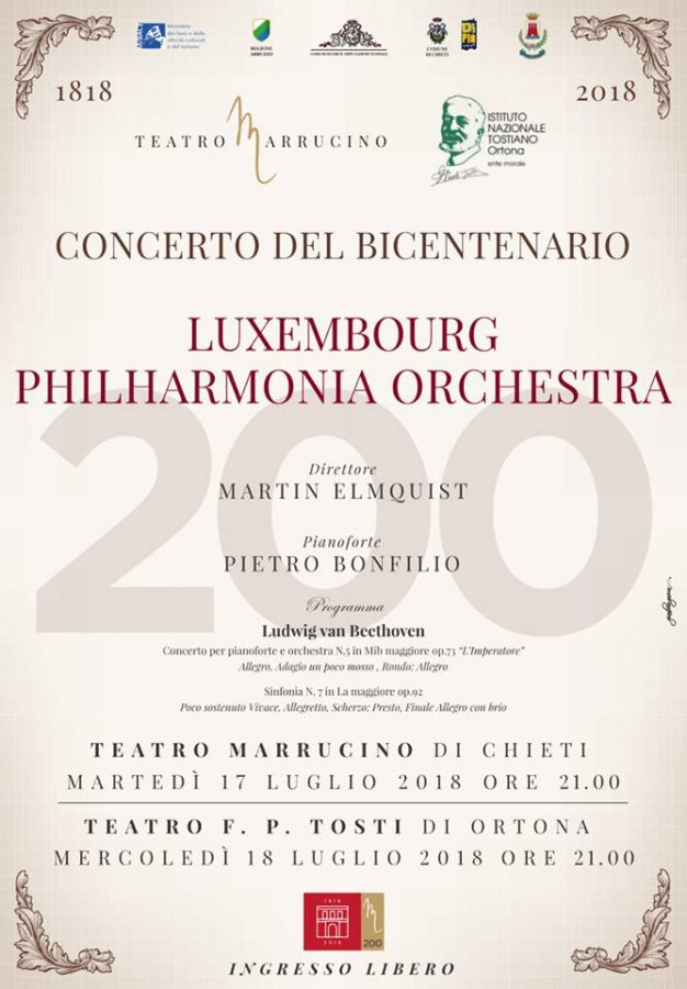 Mercoledì 18 luglio si terrà, alle ore 21,15 presso il Teatro Tosti, il secondo appuntamento del cartellone estivo organizzato dall'Istituto Nazionale Tostiano e patrocinato dal Comune di Ortona. L'evento è realizzato in collaborazione con il Teatro Marrucino di Chieti, per i 200 anni dalla fondazione. È in programma l'esecuzione del concerto numero cinque "l'Imperatore" e la settima sinfonia di Ludwig van Beethoven. Si esibirà, come solista, il pianista Pietro Bonfilio ed il maestro Martin Elmquist dirigerà la Luxembourg Philharmonia Orchestra.