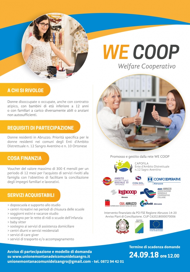 Il progetto denominato We-Coop, Welfare Cooperativo. Patto Sociale per un nuovo Welfare a favore delle lavoratrici e dei lavoratori, è finanziato dalla Regione Abruzzo attraverso il Piano Operativo del Fondo Sociale Europeo 14-20 e promosso da una Rete di Conciliazione che raggruppa enti locali e rappresentanti del mondo della formazione professionale, del lavoro, dei sindacati e della cooperazione sociale.
