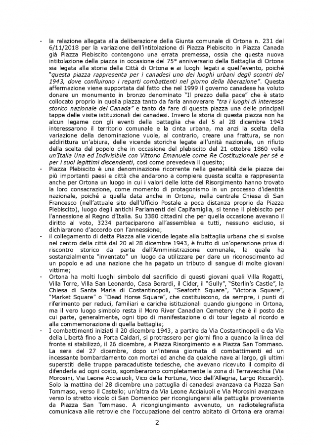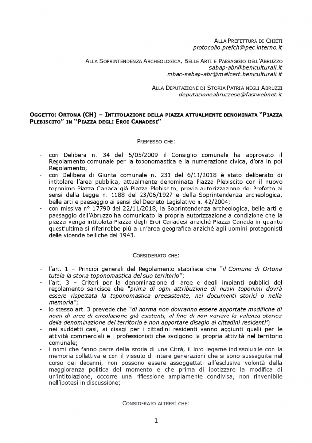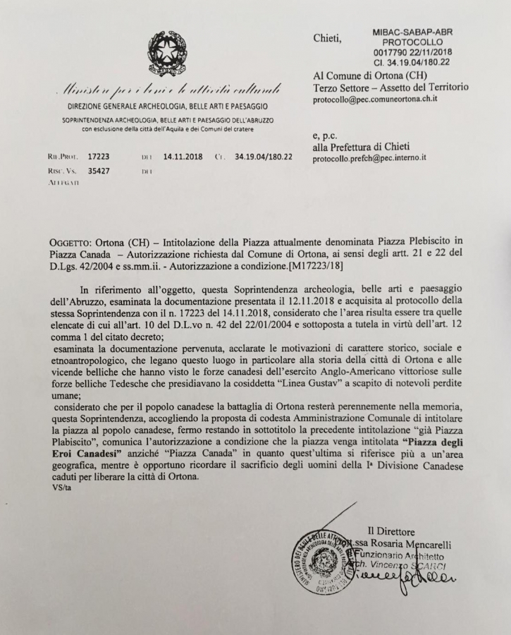 Il 22 novembre la Soprintendenza archeologica, belle arti e paesaggio dell'Abruzzo, nella persona del Funzionario Arch. Vincenzo Scarci, ha negato l'autorizzazione richiesta dall'Amministrazione comunale per la nuova intitolazione di Piazza Plebiscito in Piazza Canada.