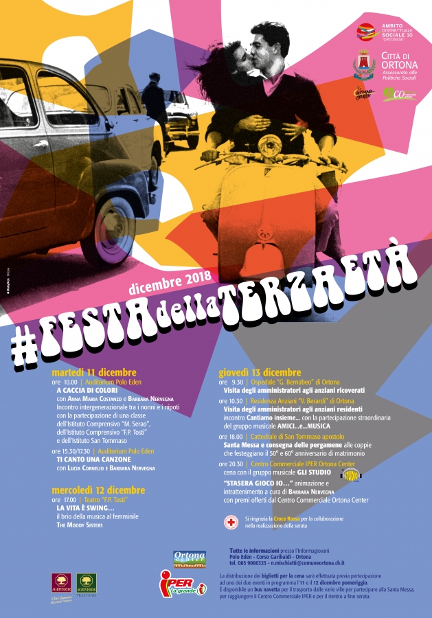 La festa della terza età organizzata dal comune di Ortona quest'anno si apre con un omaggio agli anni sessanta. Una giovane coppia in vespa, infatti, caratterizza l'immagine del manifesto che presenta le iniziative per l'edizione 2018 di un appuntamento tradizionale di incontro e socialità.