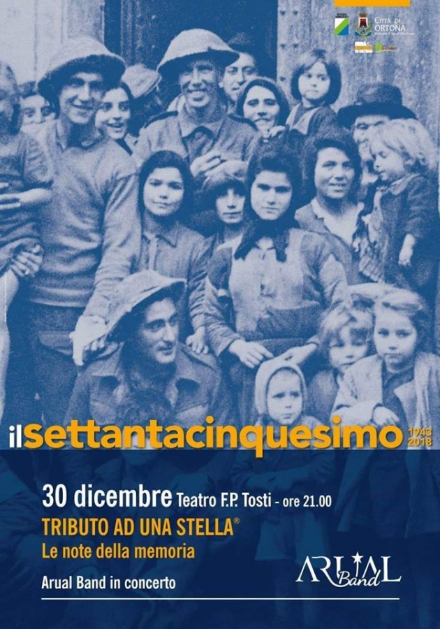 Domenica 30 dicembre alle ore 21 Teatro F.P. Tosti ultimo appuntamento del settantacinquesimo della liberazione di Ortona con il concerto "Tributo ad una Stella- Le note della Memoria" con gli Arual Band. Un ricordo per chi non c'è più...perché Ortona ha 1314 Stelle che brillano nel cielo da quel dicembre del '43