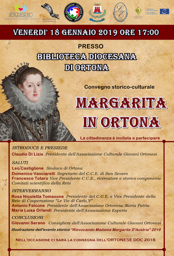 Oltre ai saluti di rito del Sindaco di Ortona e del nostro Presidente, interverranno: Rosa Nicoletta Tomasone sul tema”Le Vie Culturali europee dell'Imperatore Carlo V d'Asburgo” Presidente del Centro Culturale “L.Einaudi” e Vice Presidente della Rete di Cooperazione Europea “Le Vie di Carlo V”” da S. Severo; Antonio Falcone sul tema: “La Figura di Margarita in Ortona” Presidente dell' Associazione Ortonese Storia Patria e Maria Luisa Orlandi sul tema:”Il Palazzo Farnese e i luoghi Margaritiani Ortonesi” Presidente dell'Associazione Experio.