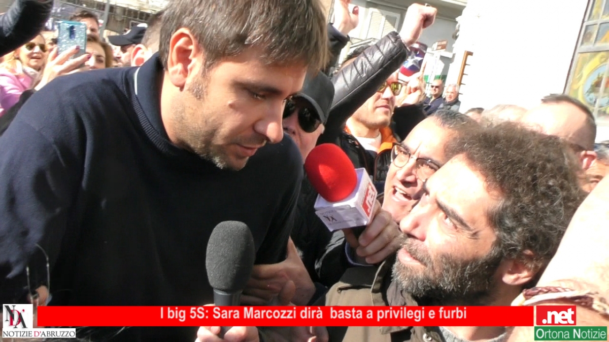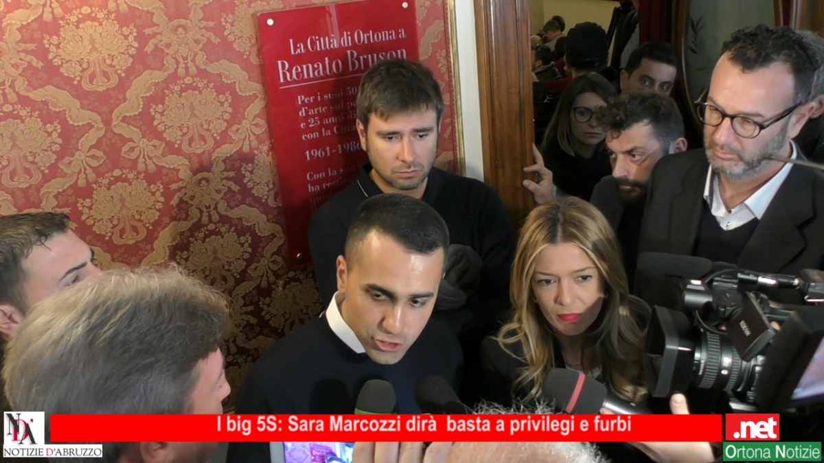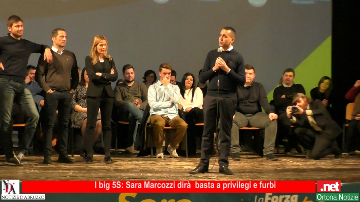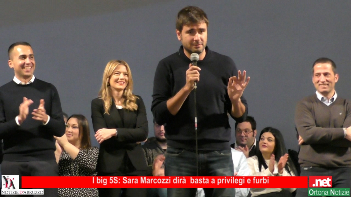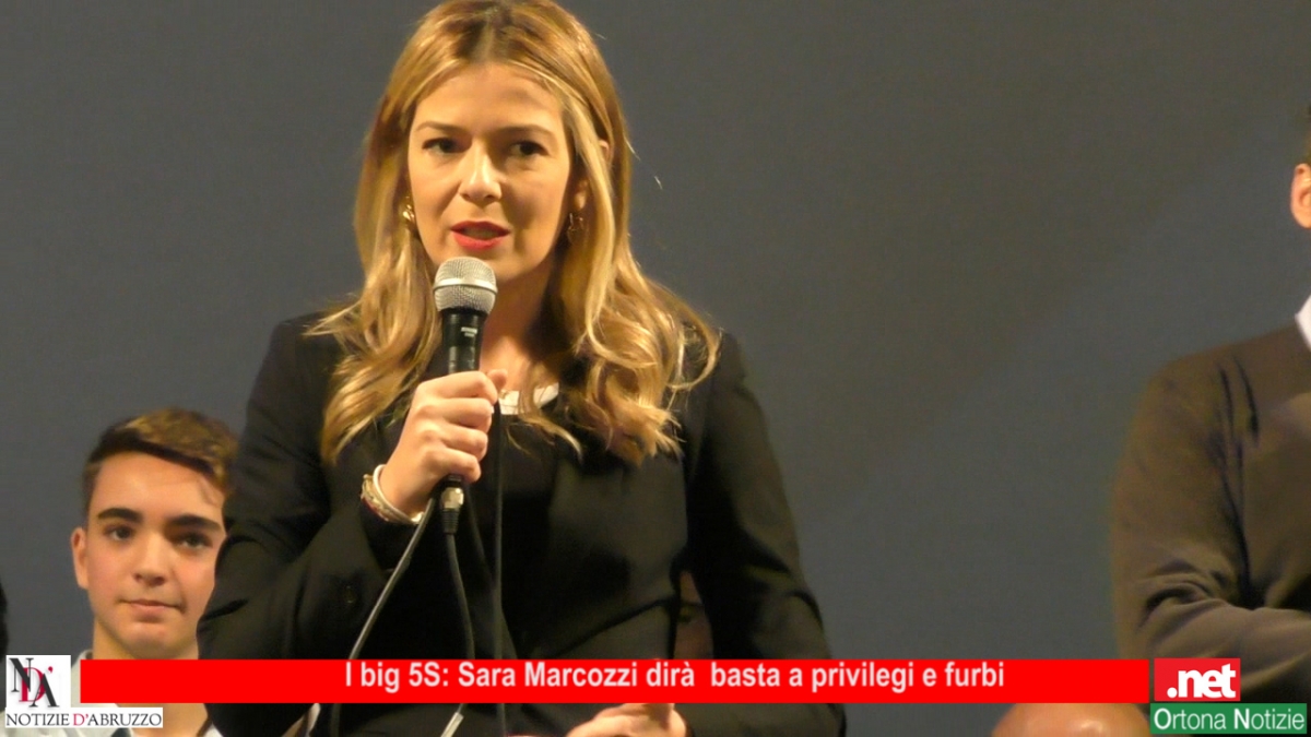 candidata alle elezioni regionali del 10 febbraio, che in mezz’ora di intervento attacca Centrodestra e Centrosinistra, i suoi affondi sono taglienti e personalizzati contro Silvio Paolucci assessore regionale alla sanità, “lui ha chiuso gli ospedali noi li riapriremo”, stilettate all’ex presidente Luciano D’Alfonso del Pd, “ha lasciato l’Abruzzo per la poltrona a Roma. Così Sta bene Rocco sta bene tutta la Rocca, ma noi li cacceremo via”, ha scandito la Marcozzi elegantissima, capelli biondo miele, rossetto vermiglio, e abito scuro stile maschietto avviatissimo e sobrissimo. Diretta e polemica la Teatina Marcozzi si mostra una candidata tosta e vincente, quindi sferza i suoi avversari: “Legnini? Un ipocrita perché è la continuità con il Pd di D’Alfonso”, “Marsilio? È il candidato del Centrodestra e fa pena nel suo volersi accreditate abruzzese, poverino cerca di essere abruzzese ripetendo qualche parola in dialetto e dicendo che mangia gli arrosticini. Questi politici dobbiamo batterli perché hanno fatto e faranno solo del male all’Abruzxo e ad Ortona, ed entrambi hanno votato tutte le leggi s danno delle persone, ad iniziare dalla Fornero”. Scroscio di applausi, una ovazione che ricarica la candidata 5S. “Noi abbiamo tagliato i nostri stipendi per comprare una turbina”, racconta e aggiunge Sara Marcozzi “noi vogliamo un Abruzzo pulito, giusto, con servizi efficienti, sicuri. Cambieremo con il vostro voto questa regione”. Altri applausi che ingentiliscono la Marcozzi che riceve un boucher di fiori bianchi.