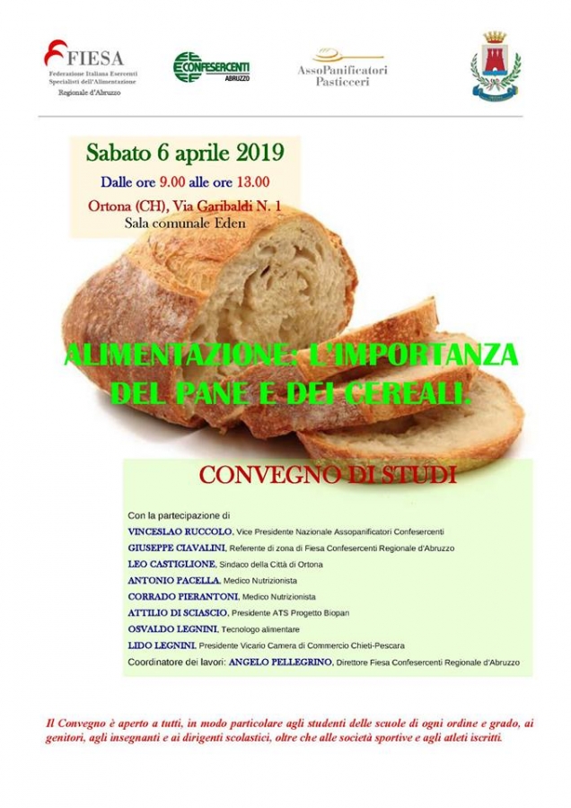 Nel Convegno "Alimentazione: l'importanza del Pane e dei Cereali", che si terrà a Ortona sabato 6 aprile, presso la Sala Eden, si cercherà di rispondere alle domande e a fugare i dubbi dei consumatori, anche e soprattutto con risposte scientifiche, sul fatto che non è assolutamente dimostrato che il Pane sia responsabile nell'insorgere di tutto un insieme di disturbi, frutto soltanto di scarsa informazione. Probabilmente deriva tutto dalla facile riconoscibilità del Pane, forse per la sua diffusione, o forse perché, diciamolo con coraggio, il Pane è buono.