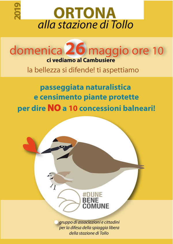 Nel frattempo crescono le adesioni alla manifestazione di domani, domenica 26 maggio, lanciata da associazioni e cittadini che si sono riunite nel gruppo #DuneBeneComune: l'appuntamento è alle ore 10 al lido Cambusiere (stazione di Tollo) per una passeggiata naturalistica con censimento di flora e fauna protetta.