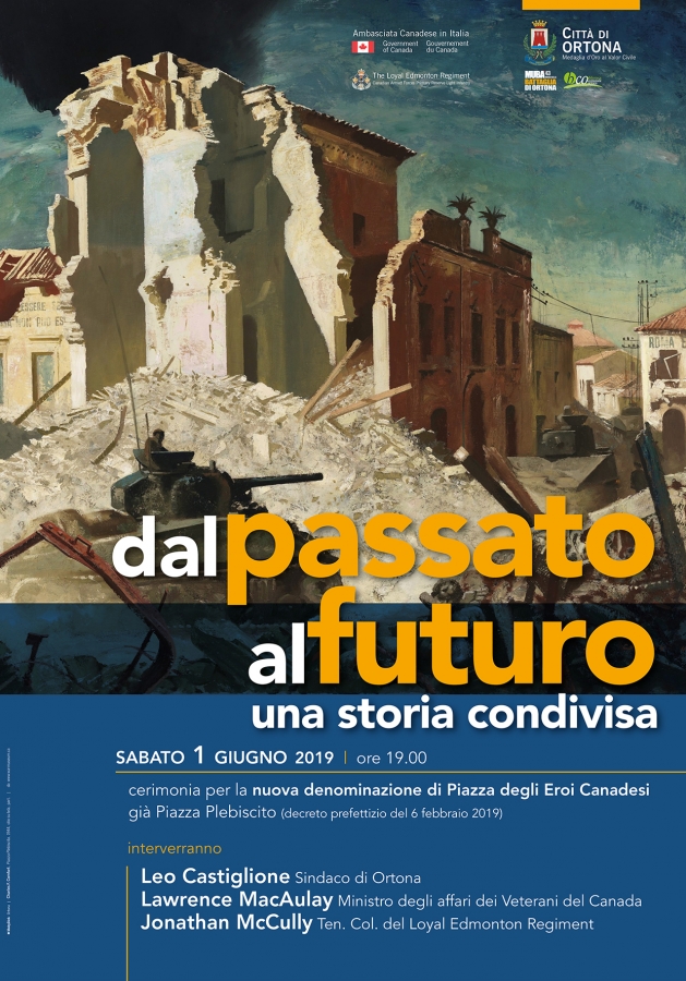 Il nuovo toponimo della Piazza degli Eroi Canadesi già Piazza Plebiscito sarà inaugurato dall'amministrazione comunale sabato 1 giugno con una cerimonia a partire dalle ore 19. Il procedimento amministrativo per la nuova denominazione si è concluso lo scorso 6 febbraio con l'approvazione da parte del Prefetto di Chieti che ha ribadito le motivazioni di carattere storico, sociale e etnoantropologiche che hanno sostenuto la scelta del cambio di nome della piazza che con il monumento "Il prezzo della Pace" è diventata luogo della memoria nazionale del Canada e delle associazioni dei veterani. La cerimonia oltre a rendere omaggio al ricordo dei caduti dell'inverno 1943 e rinsaldare l'amicizia e la riconoscenza tra le comunità ortonese e canadese sarà occasione per presentare il progetto urbano che l'amministrazione Castiglione ha programmato per la piazza. Un progetto che prevede una nuova veste urbana che renda la piazza non solo un luogo dedicato al ricordo ma anche un centro di vita quotidiana, di aggregazione, di incontri e attività cittadina. Alla cerimonia parteciperà il ministro degli affari Veterani del Canada Lawrence MacAuly e l'ambasciatrice Alexandra Bugailiskis, insieme ad una rappresentanza del Loyal Edmonton Regiment.