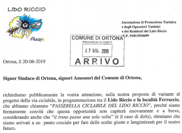 Questa volta è un treno di opportunità; precisamente l'opportunità di avere una vera novità dal punto di vista architettonico e paesaggistico che possa diventare un motivo di attrazione per tutto il comprensorio, come sottolinea Ruggero Veri dell'Associazione Operatori Turistici e Residenti del Lido Riccio.