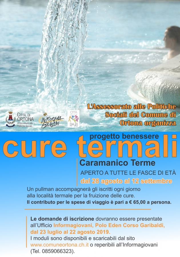 Da martedì 23 luglio sono aperte le iscrizione al progetto benessere "Cure termali" nell'ambito delle attività programmate dall'ambito distrettuale sociale ortonese. L'assessorato alle politiche sociali del comune di Ortona, ha predisposto il servizio che si svolgerà dal 28 agosto all'12 settembre con un autobus che ogni giorno accompagnerà gli iscritti presso la rinomata località abruzzese per le cure termali.
