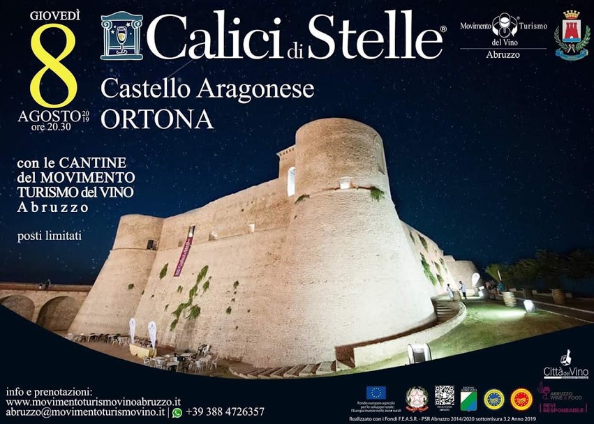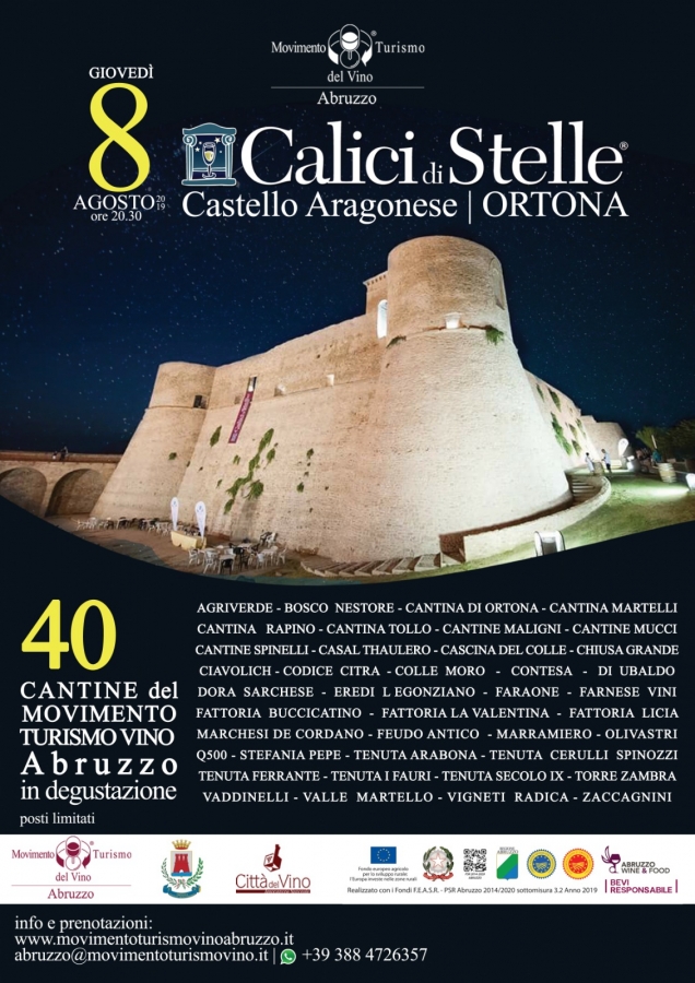 Tutto pronto ad Ortona per l’evento regionale di Calici di Stelle in programma giovedì 8 Agosto dalle ore 20.30 all’interno del suggestivo Castello Aragonese proprio a picco sul Mar Adriatico. Dopo la serata dell’anno scorso nella Fortezza di Civitella del Tronto si torna in grande stile nella cittadina ortonese che vedrà ben 40 tra le migliori cantine regionali accogliere le centinaia di winelovers che arriveranno da ogni parte d’Italia per questo appuntamento che si preannuncia indimenticabile.