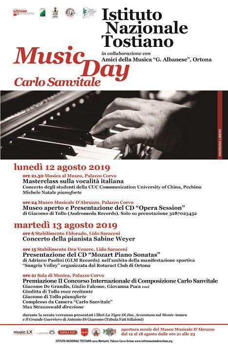 Infine, alle ore 21, nella sede dell’Istituto Tostiano sarà celebrata la premiazione del 2° Concorso Internazionale di composizione “Carlo Sanvitale” collegato al Music Day. L’iniziativa è dedicata alla memoria di Carlo Sanvitale, storico presidente dell’Associazione Amici Della Musica “Guido Albanese” di Ortona, cui è intitolato anche il complesso che si esibisce ogni anno durante la manifestazione formato da: Giacomo De Grandis, Giulio Falcone, Giovanna Puca, voci; Giuditta Di Tollo, voce recitante; Giacomo Di Tollo, pianoforte; Max Strausswald, direzione.