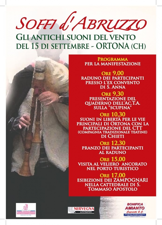 L’ Ac.T.A. ( Accademia dei Transumanti degli Abruzzi ) organizza a Ortona domenica 15 settembre, il suggestivo raduno nazionale degli amanti della zampogna “ Soffi D’Abruzzo “.
