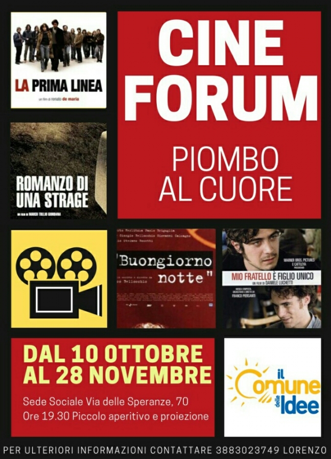Il cineforum nella sede dell'associazione si svolgerà ogni 15 giorni il giovedì con i film "Mio fratello è figlio unico", "La prima linea" e "Buongiorno, notte". "Invitiamo tutta la cittadinanza a partecipare numerosa a questi incontri di approfondimento" conclude la presidente Carmela Pagnanelli "soprattutto gli studenti delle scuole Medie e Superiori della città , con cui stiamo intavolando una collaborazione. Questo percorso è rivolto soprattutto a loro con l'obiettivo di offrirgli uno sguardo chiaro ed oggettivo su un periodo importante e complesso della storia dell'Italia repubblicana"
