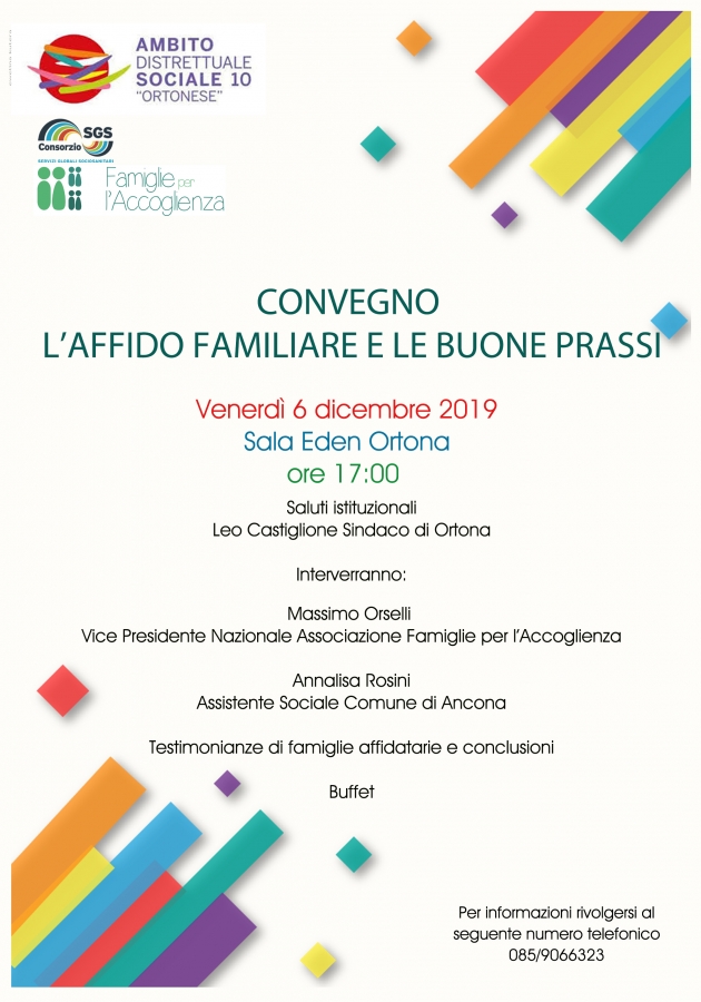 La famiglia è al centro del convegno organizzato, venerdì 6 dicembre a partire dalle ore 17 alla Sana Eden di Ortona, all’interno delle attività del progetto “Dimensione Famiglia” redatto dal Comune di Ortona, Ente Capofila dell’Ambito Distrettuale Sociale n. 10 “Ortonese” e finanziato, con un importo di circa 37mila euro, dalla Giunta regionale nell’ambito del Piano di Interventi Regionali in favore della Famiglia 2018.