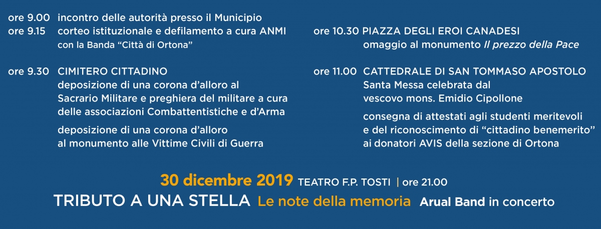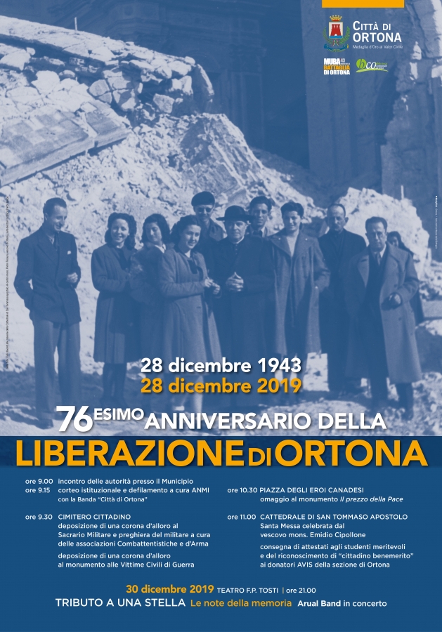 La cerimonia commemorativa della mattinata del 28 dicembre concluderà invece un anno significativo per la storia della nostra comunità con la ricorrenza dei 60 anni dalla concessione della Medaglia d'oro al valore civile alla città di Ortona per il sacrificio umano e sociale patito 75anni fa nel corso dei cruenti combattimenti sulla linea Gustav. «E il legame con quei tragici avvenimenti – continua il sindaco Leo Castiglione – è stato suggellato con importanti avvenimenti in ricordo del contributo sofferto dai militari canadesi per la liberazione della città, che si sono succeduti nel corso dell'anno a iniziare dalla denominazione di piazza degli Eroi canadesi, la visita della Governatrice del Canada Julie Payette e del Ministro della difesa Harjit Singh Sajjan, insieme all'ambasciatrice Alexandra Bugailiskis e al ministro canadese degli affari dei veterani Jonathan McAuly».Le celebrazioni del 28 avranno inizio alle 9