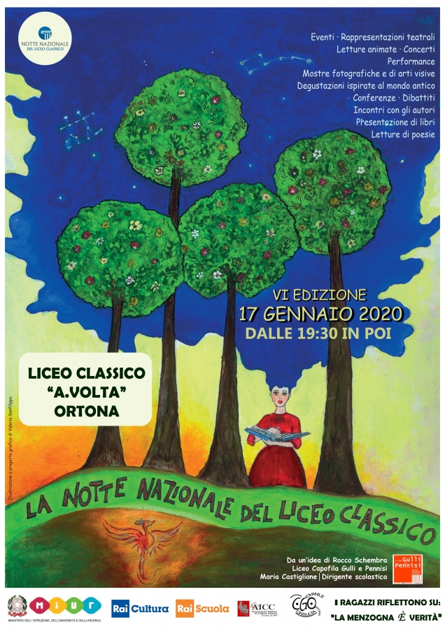 Anche quest’anno il Liceo Classico di Ortona parteciperà alla Notte Nazionale del Liceo Classico: nata da un’idea del prof. Rocco Schembra, docente di Latino e Greco presso il Liceo Classico Gulli e Pennisi di Acireale (CT) e sostenuta dal Ministero della Pubblica Istruzione, si svolgerà in contemporanea nazionale in ben 436 Licei disseminati su tutta la penisola, con l’obiettivo di rilanciare la cultura umanistica, nella sua più ampia accezione, e dimostrare che il Liceo Classico, lungi dall’essere un indirizzo di studi antiquato, è invece animato dall’entusiasmo di tanti studenti preparati e attivi in vari ambiti della conoscenza.