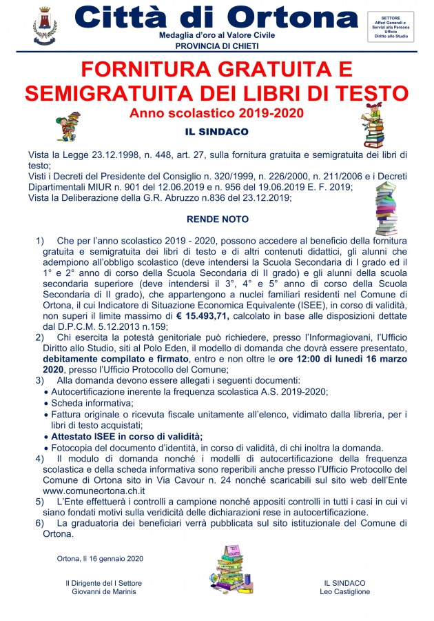 È stato pubblicato nella sezione "servizi" e quindi diritto allo studio del sito comunale, l'avviso per la fornitura gratuita o semigratuita di libri di testo per l'anno scolastico 2019/2020. Possono accedere al beneficio della fornitura gratuita totale o parziale gli alunni che frequentano la scuola secondaria di primo e secondo grado, che appartengono a nuclei familiari il cui indicatore ISEE non superi il limite massimo di euro 15.493,71.