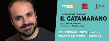 Il Catamarano, monologo scritto da Gabriele Mazzucco e magistralmente interpretato da Andrea Alesio, è uno spettacolo brioso che sa creare profondi, assoluti e riflessivi momenti di silenzio in sala e momenti di gioiosa allegria per le sue battute, mai scontate. Su tutto lo spettacolo aleggia la meravigliosa figura del nonno sempre vivo nel cuore di Andrea e suo costante punto di riferimento. Questa la sinossi: il giovane Andrea è un ragazzo come tanti che coltiva il grande sogno di diventare attore. E’ lui a raccontare la sua storia corale in prima persona, unico interlocutore, seppure assente, suo nonno Angelo Mario. Tra le figure che emergono, il giovane regista naif che si crede proiettato verso il successo grazie alla sua versione contemporanea dell’opera Il catamarano.