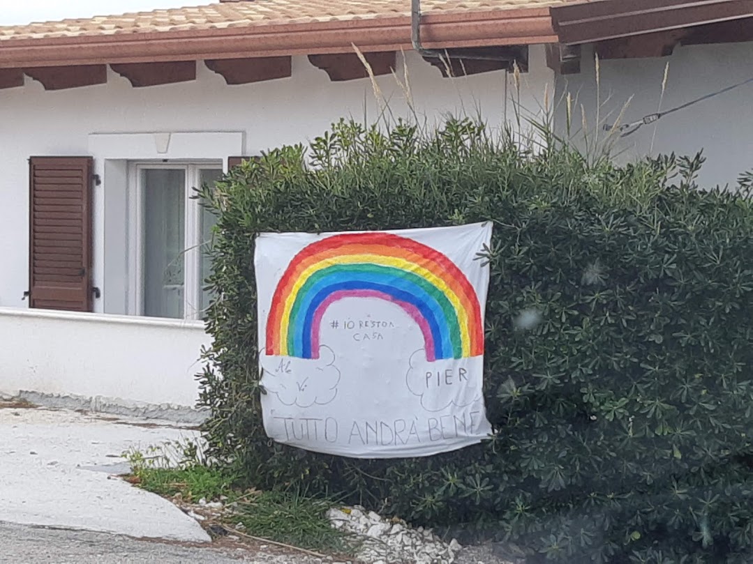“io resto a casa” come si legge , poco più avanti , su un striscione appoggiato su una siepe ,