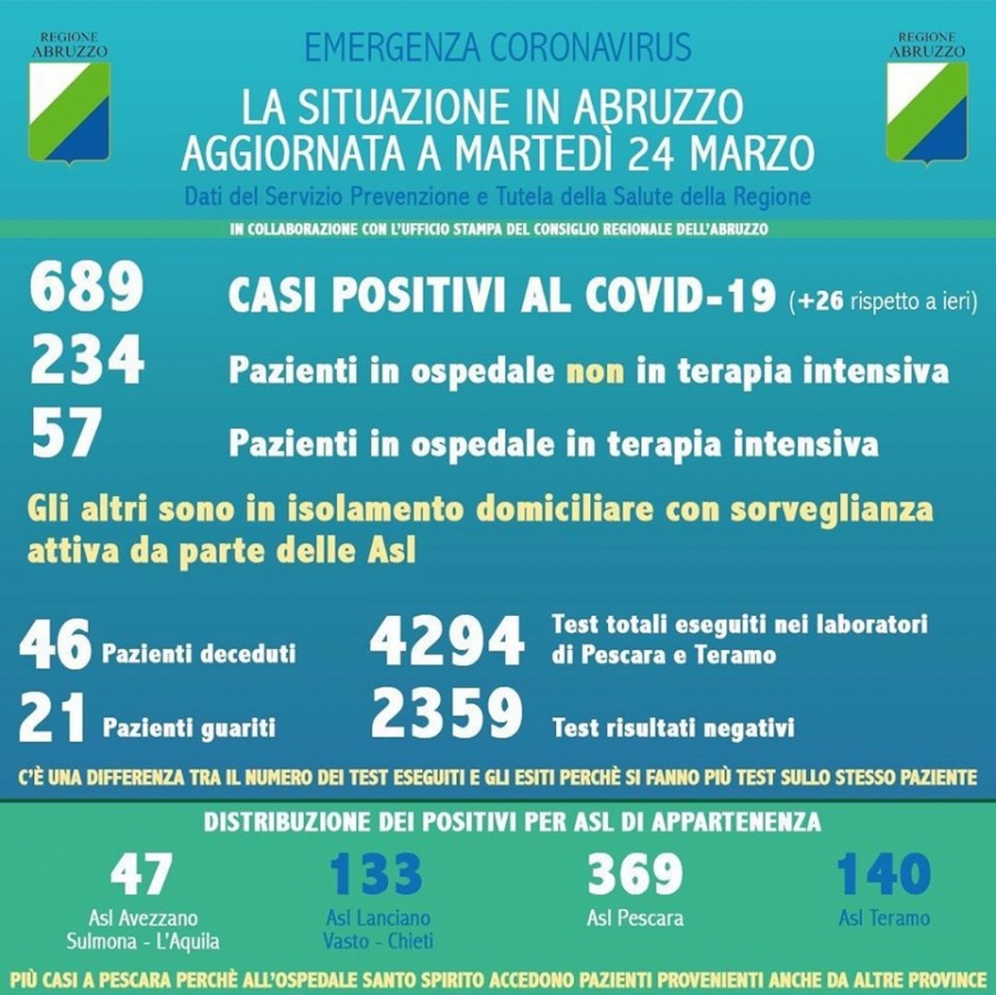 dall'inizio dell'emergenza, sono stati registrati 689 casi positivi al Covid 19, diagnosticati dai test eseguiti nel laboratorio di riferimento regionale di Pescara, anche attraverso l'Istituto Zooprofilattico di Teramo. Rispetto a ieri si registra un aumento di 26 nuovi casi.