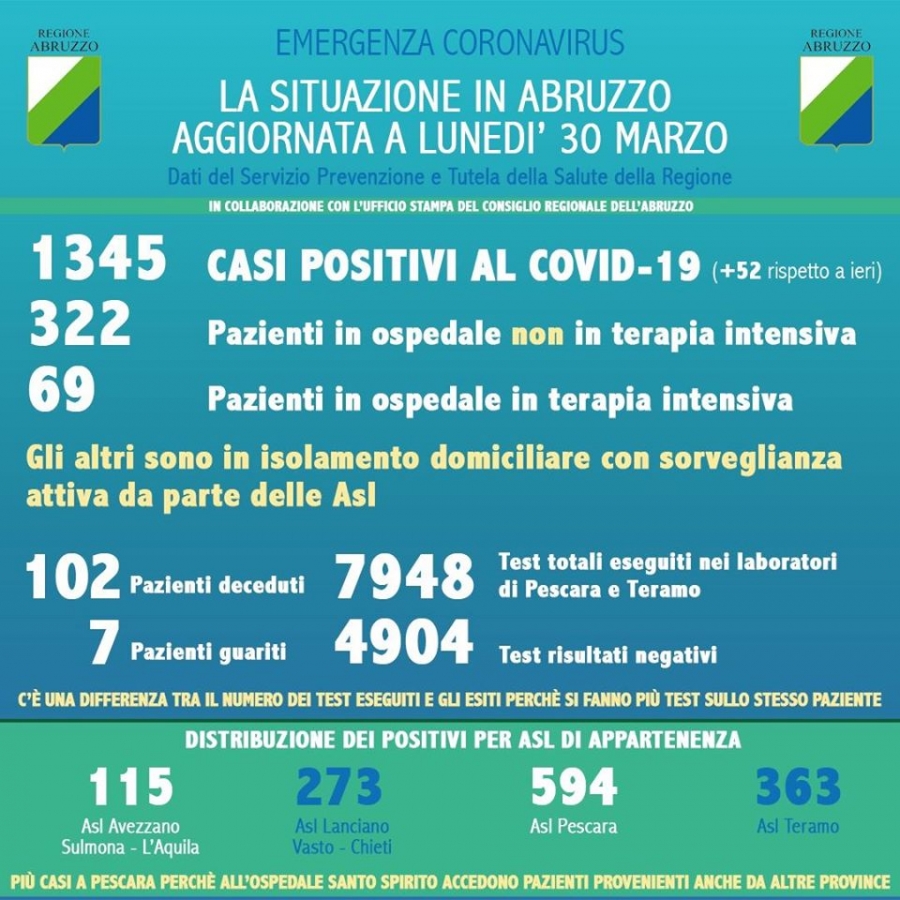 Del totale dei casi positivi, 115 si riferiscono alla Asl Avezzano-Sulmona-L’Aquila, 273 alla Asl Lanciano-Vasto-Chieti, 594 alla Asl di Pescara e 363 alla Asl di Teramo.