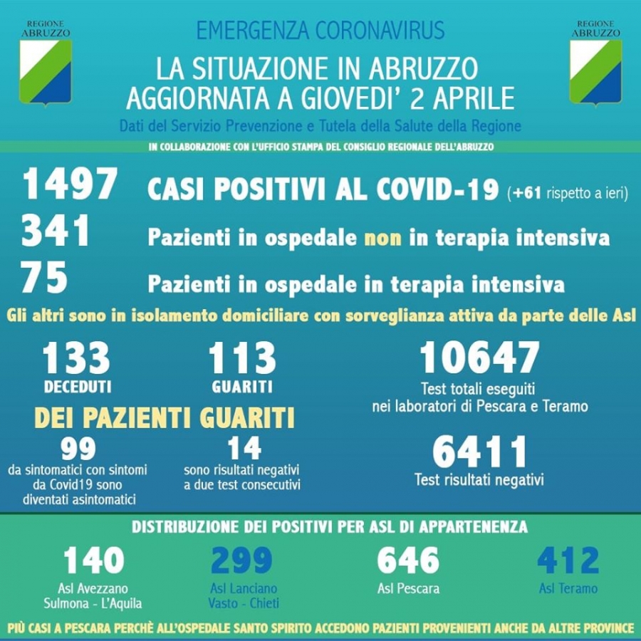 dall’inizio dell’emergenza, sono stati registrati 1.497 casi positivi al Covid 19, diagnosticati dai test eseguiti nel laboratorio di riferimento regionale di Pescara, anche attraverso l’Istituto Zooprofilattico di Teramo. Rispetto a ieri si registra un aumento di 61 nuovi casi.