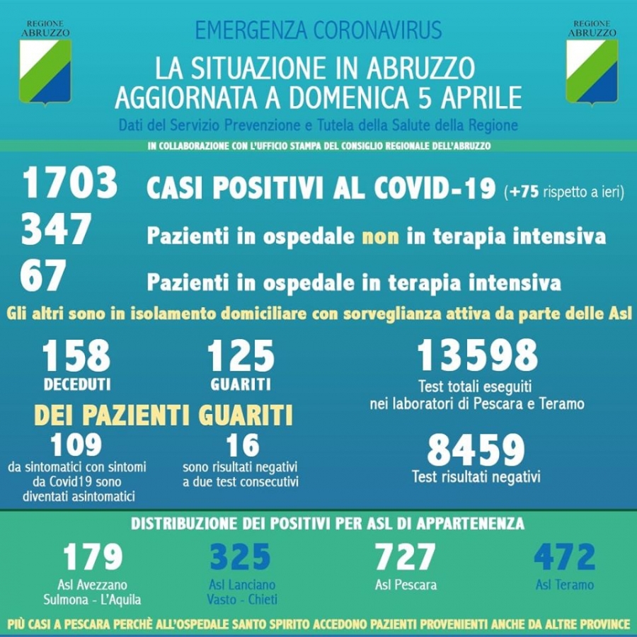 dall’inizio dell’emergenza, sono stati registrati 1.703 casi positivi al Covid 19, diagnosticati dai test eseguiti nel laboratorio di riferimento regionale di Pescara, anche attraverso l’Istituto Zooprofilattico di Teramo. Rispetto a ieri si registra un aumento di 75 nuovi casi.