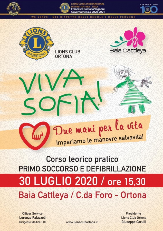 “Viva Sofia! Due mani per la vita, impariamo le manovre salvavita!”. Ecco la bella e utilissima iniziativa promossa dal Lions club di Ortona tenuta al lido Cattleya di contrada Foro di Ortona il 30 luglio alle 15. Il tema del seguitissimo incontro, “Corso teorico pratico. Primo soccorso e defibrillazione”. Un servizio offerto dal dottor Lorenzo Palazzoli operatore del 118. L’appuntamento rientra nelle iniziative che il Lions Club di Ortona mette in campo a favore del territorio e di quanti hanno desiderio di partecipare ad incontri a tema dedicati al sociale, alla cultura e ai servizi utili alla persona. “Il Viva Sofia!”