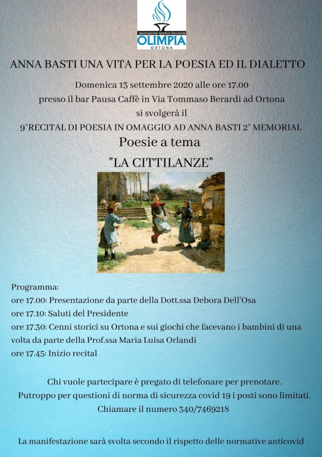 Da otto anni l'associazione culturale sportiva Olimpia con la presidente Annamaria di Lorenzo e la storica Marialuisa Orlandi organizza con tutti i soci un recital di poesie in onore di Anna Basti.
