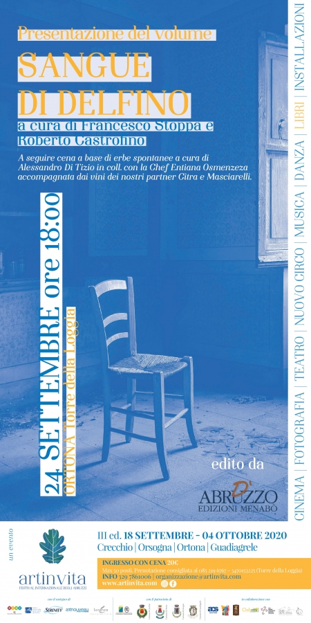 Ventisette anziani svelano i segreti che raccontano il loro legame con l'Abruzzo e le sue innumerevoli risorse naturali e ambientali. A custodirli il libro Sangue di Delfino edito da Edizioni Menabò, curato dal professor Francesco Giovanni Maria Stoppa, e arricchito dalle fotografie di Roberto Castrofino, che sarà presentato giovedì 24 settembre alle ore 18:00 alla Torre della Loggia,
